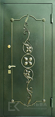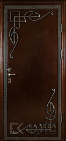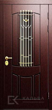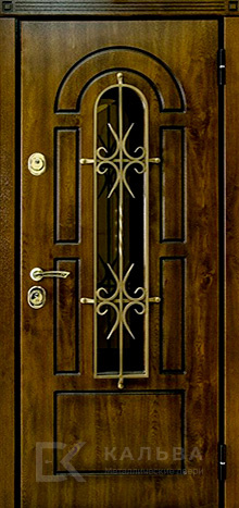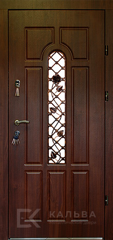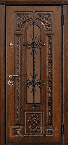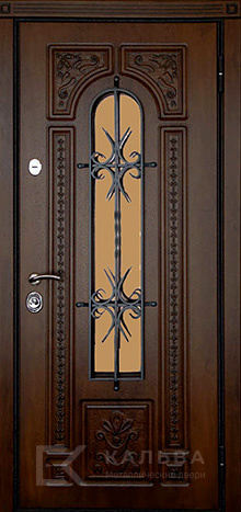 Фото «Стальная дверь орех с арочным стеклом кованым узором и резьбой №7»