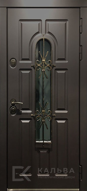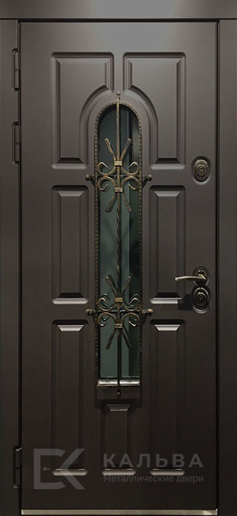 Фото №2 «Железная тёмная дверь для частного дома с ковкой и стеклом №3»